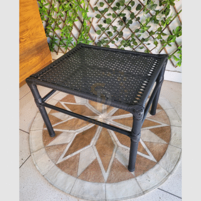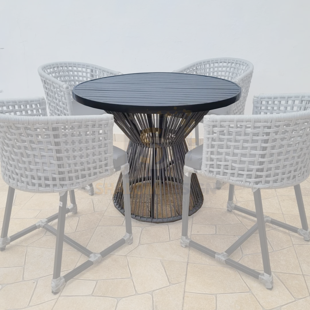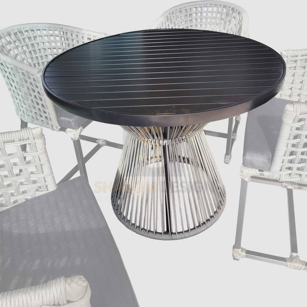 O tampo ripado confere um visual elegante e moderno, enquanto o trançado em corda náutica adiciona um toque artesanal exclusivo, além de resistência às variações climáticas.